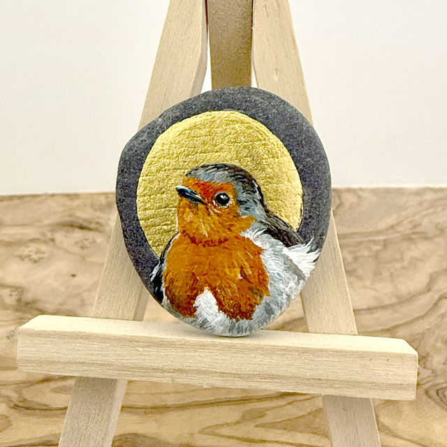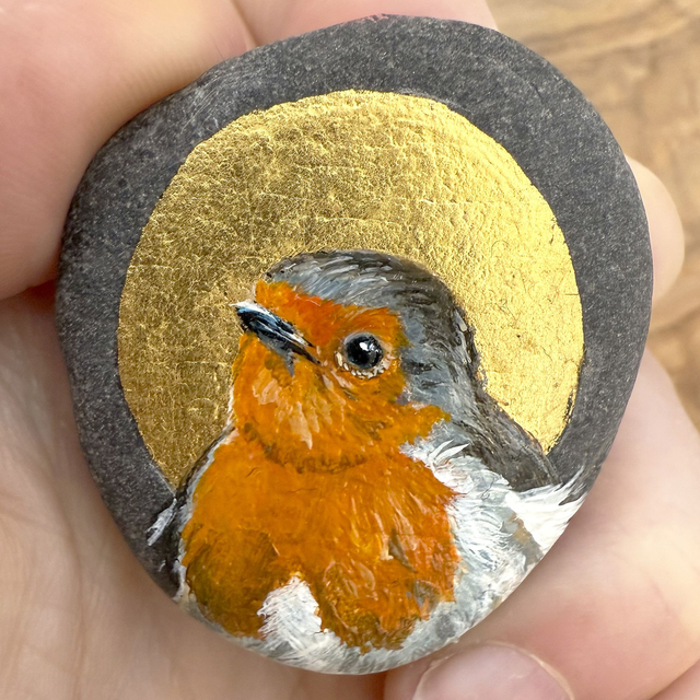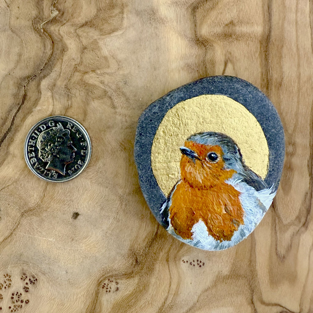 One off original artwork - part of the flock of rocks I have been creating since I lost my father. Typically a lot of Robins have 'appeared. Birds are often seen as visitors from the spirit world. This one is a very pretty, demure-looking little robin that spoke to me